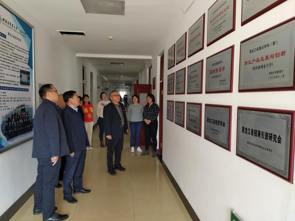 孟凡龙书记参观了学院图书资料室、现代商品流通研究基地、党员活动室,还走访了学院各专业教研室并和老师们进行了亲切交谈。在学院荣誉墙前韩平院长向孟凡龙书记介绍了学院历史传承及取得的相关荣誉。