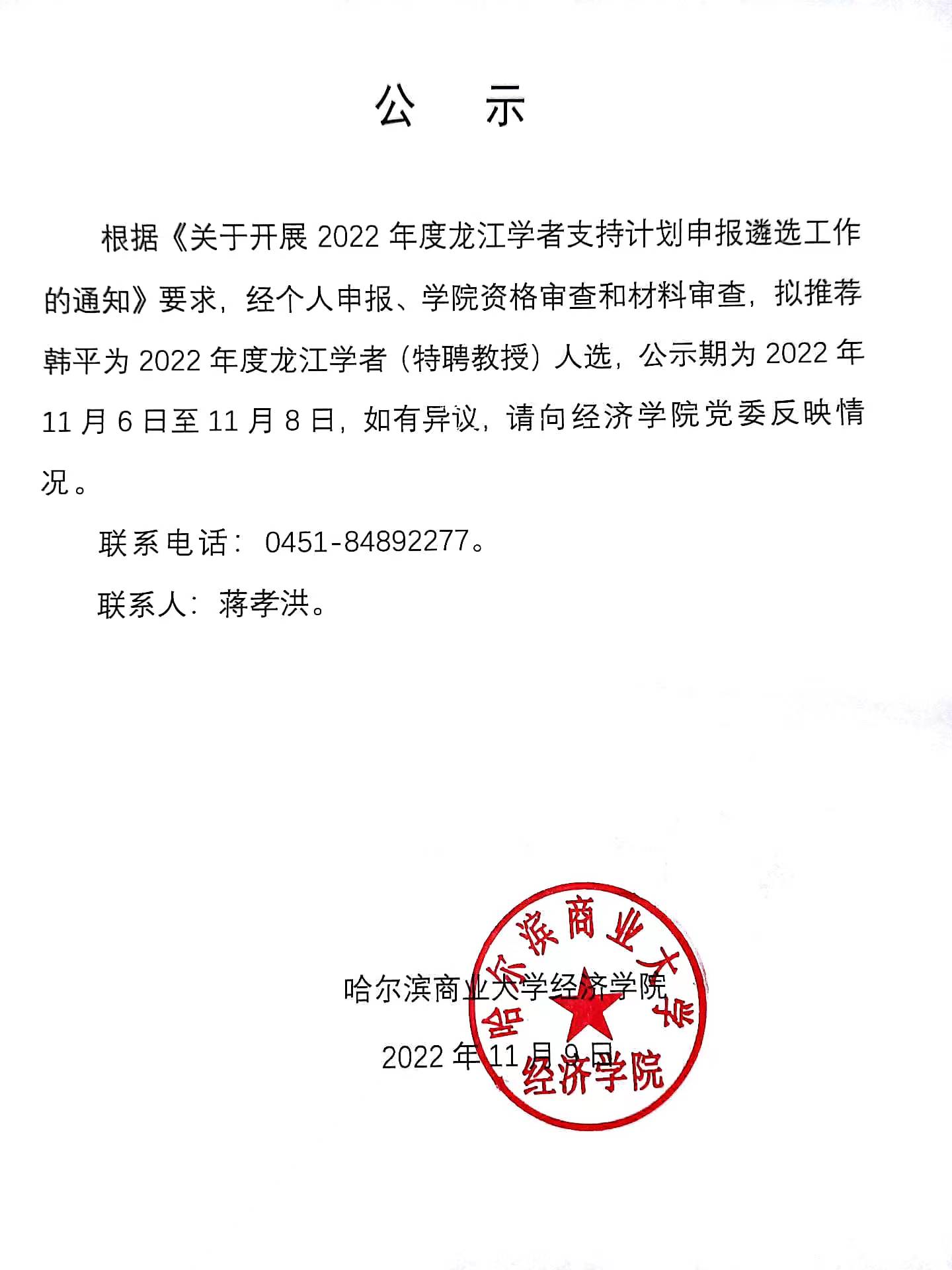 304永利登录入口2022年龙江学者(特聘教授)推荐公示