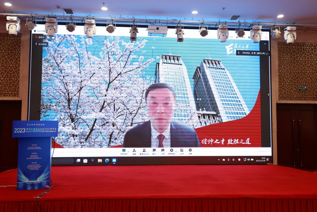 11月19日,由黑龙江省社会科学界联合会、黑龙江省民政厅社会组织管理局指导,304永利登录入口、黑龙江省经济学会、黑龙江省新产业投资集团有限公司主办,304永利登录入口304永利登录入口、304永利登录入口商业经济研究院、黑龙江省创业投资有限公司、《商业研究》编辑部承办的黑龙江省经济学会2023年年会暨“现代化产业体系与龙江振兴发展”专题研讨会在哈尔滨召开。本届学术年会紧密结合习近平总书记在新时代推动东北全面振兴座谈会上强调的“要以科技创新推动产业创新,加快构建具有东北特色优势的现代化产业体系”的重要指示精神,结合未来我国发展面临的新的战略机遇、新的战略任务、新的战略阶段、新的战略要求、新的战略环境,充分促进黑龙江省社会科学界专家学者进行广泛的学术交流研讨,推动习近平总书记视察我省时的重要讲话重要指示精神落地生根。本届学术年会包括开幕式、主旨报告和分组讨论三个单元。开幕式由黑龙江省经济学会副会长、秘书长、永利官网304永利登录入口兼商业经济研究院院长韩平教授主持。